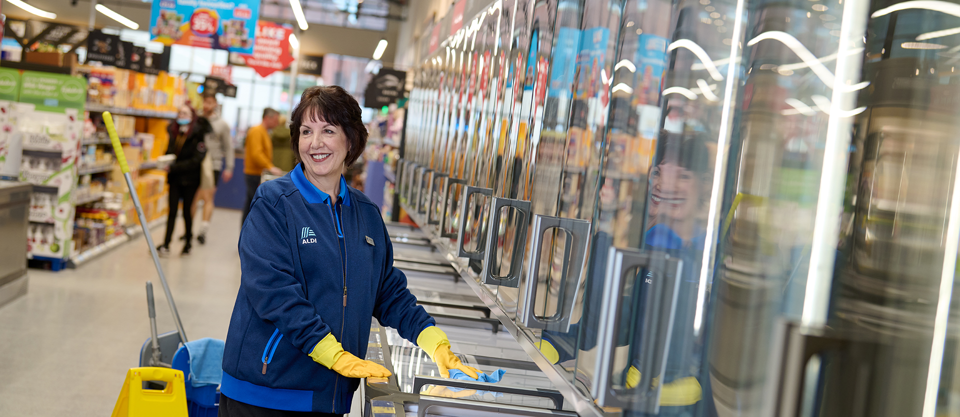 It'll see you tackle things like removing litter and debris from the car park and loading bay. Washing external windows and glass doors until they sparkle. Or making sure the trolleys are clean and free of rubbish, just the way our customers like them. We're good at lots of things at Aldi, but we're particularly good at looking after our people. It's just another of the many things that makes us stand out head and shoulders above the rest. And we'll make every effort to show our appreciation, with some of the best pay rates in the sector and a friendly, supportive working environment.